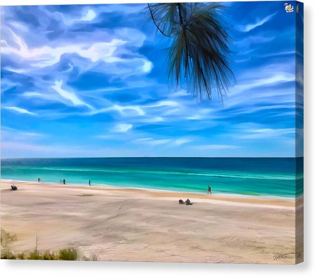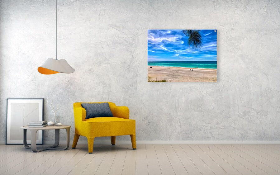 Transform your space with this tranquil, serene beach vista. This impressionistic coastal scene features turquoise waters and scattered figures on sugar sands, giving the impression of tranquility, untouched beauty, and the kind of beach day's relaxation and contemplation. The art style, with its smooth textures and softened edges, enhances the dreamlike quality of the scenery.