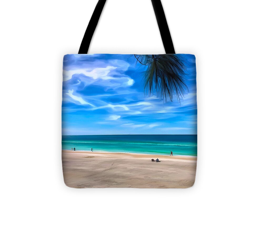 Purchase a tote bag featuring the digital art "Impressionistic Beach Scene" by Lynn Tran. Our tote bags are made from soft, durable, poly-poplin fabric and include a 1" black strap for easy carrying on your shoulder. All seams are double-stitched for added durability. Each tote bag is machine-washable in cold water and is printed on both sides using the same image.