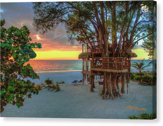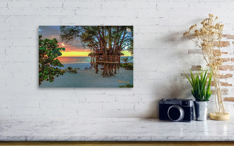 "Sunset at Beach Treehouse" – a captivating digital artwork capturing a serene beachside sunset. This enchanting piece features a charming treehouse nestled among lush foliage, overlooking the tranquil ocean at sunset, painting the sky in vibrant tropical hues. Beautify your home with this amazing coastal beauty and let your imagination escape to this idyllic retreat.