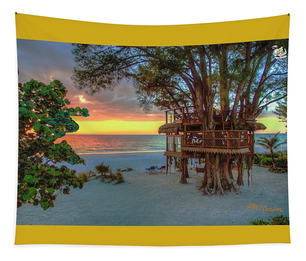 "Sunset at Beach Treehouse" – a captivating digital artwork capturing a serene beachside sunset. This enchanting piece features a charming treehouse nestled among lush foliage, overlooking the tranquil ocean at sunset, painting the sky in vibrant tropical hues. Beautify your home with this fantastic coastal beauty and let your imagination escape to this idyllic retreat.