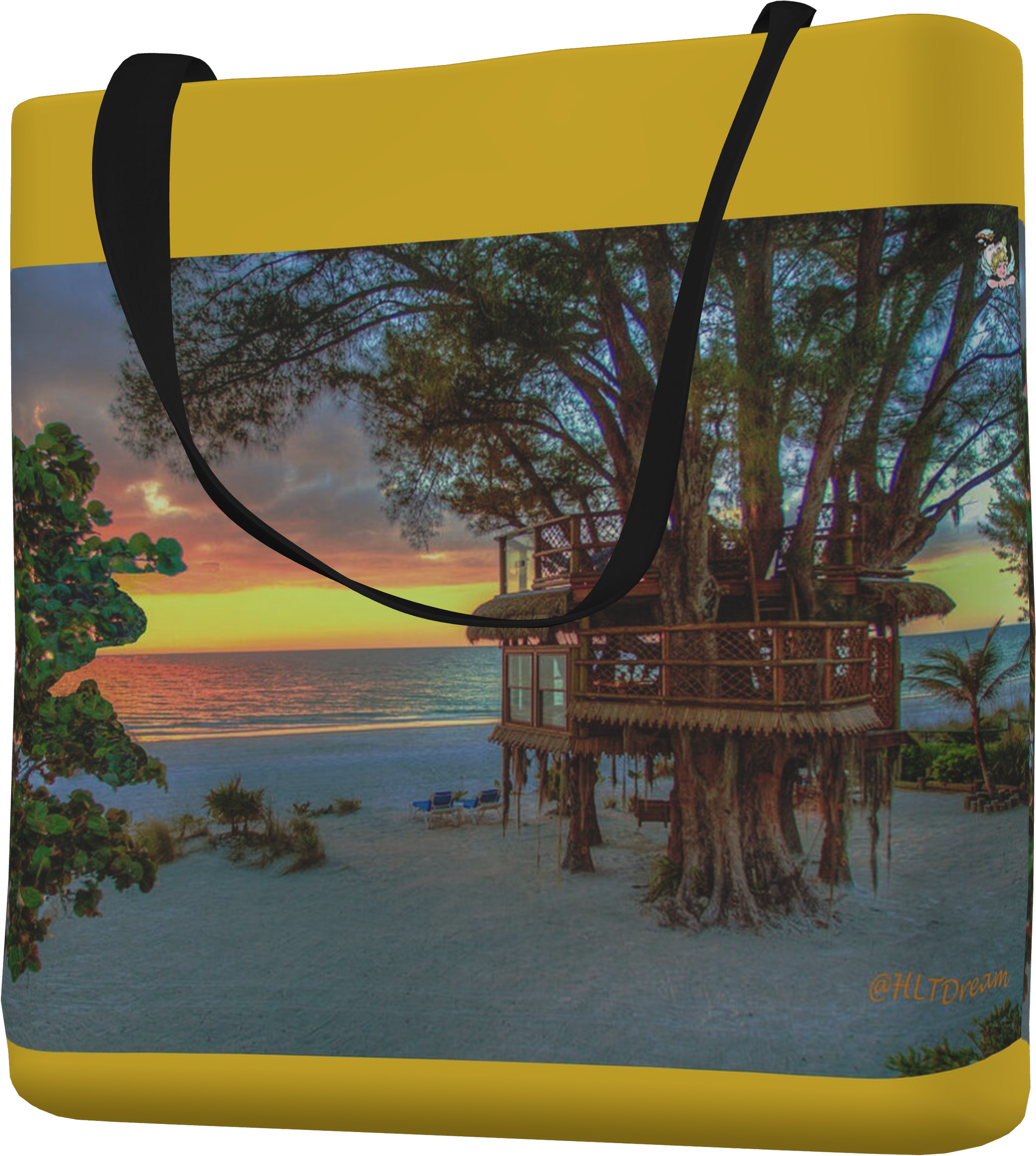 Purchase a tote bag featuring the digital art "Sunset at Beach Treehouse" by BeachLynn Treehouse Haven. Our tote bags are made from soft, durable, poly-poplin fabric and include a 1" black strap for easy carrying on your shoulder. All seams are double-stitched for added durability. Each tote bag is machine-washable in cold water and is printed on both sides using the same image.