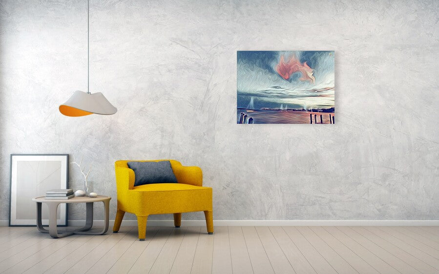 This artwork captures the beauty of a coastal sunset with a creative twist. The image is painted with swirling textures that accentuate the natural curves and flow of the seascape, reminiscent of Van Gogh's expressive brushwork. The sky reflects soft, muted tones of blue and grey, contrasted by a bold splash of warm red and orange hues, evoking the last fiery breath of the sun as it dips below the horizon. The water reflects a dance of color with gentle ripples, and the boats' silhouettes at rest provide a tranquil sense of harmony. A wooden dock in the foreground anchors the composition, leading the viewer's eye into the distance and inviting them to pause and reflect. This piece would resonate with those who appreciate the coast, cherish moments of peace, and seek a touch of impressionistic flair in their art collection.